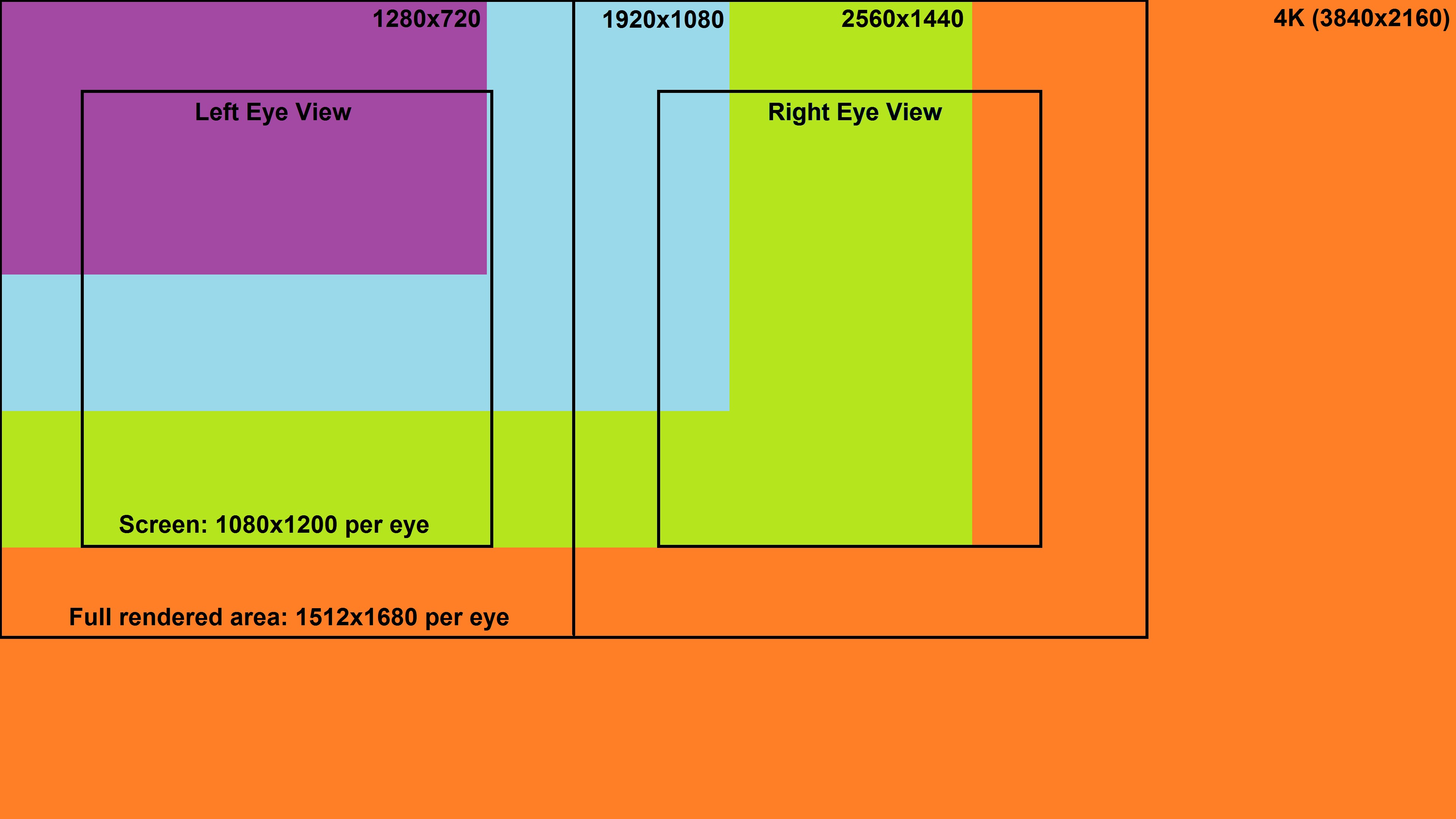 Having a powerful video card is critical for virtual reality performance as it directly impacts the ability of the computer to keep up with the high resolution and frame rate which a good VR experience requires. The initial release versions of the HTC Vive and Oculus Rift both have dual displays, one for each eye, at 1080x1200 resolution. These run at 90Hz, which is 50% higher than the standard refresh rate of monitors, and the perspective of each eye is slightly different so it is actually rendering two distinct views rather than just a single, larger display. Some VR head mounted displays also require off-screen rendering of an area around the actual display that each eye is given, which requires further resources from the video card. Here is a chart of four common monitor resolutions with the effective resolution of a HTC Vive overlayed for comparison: