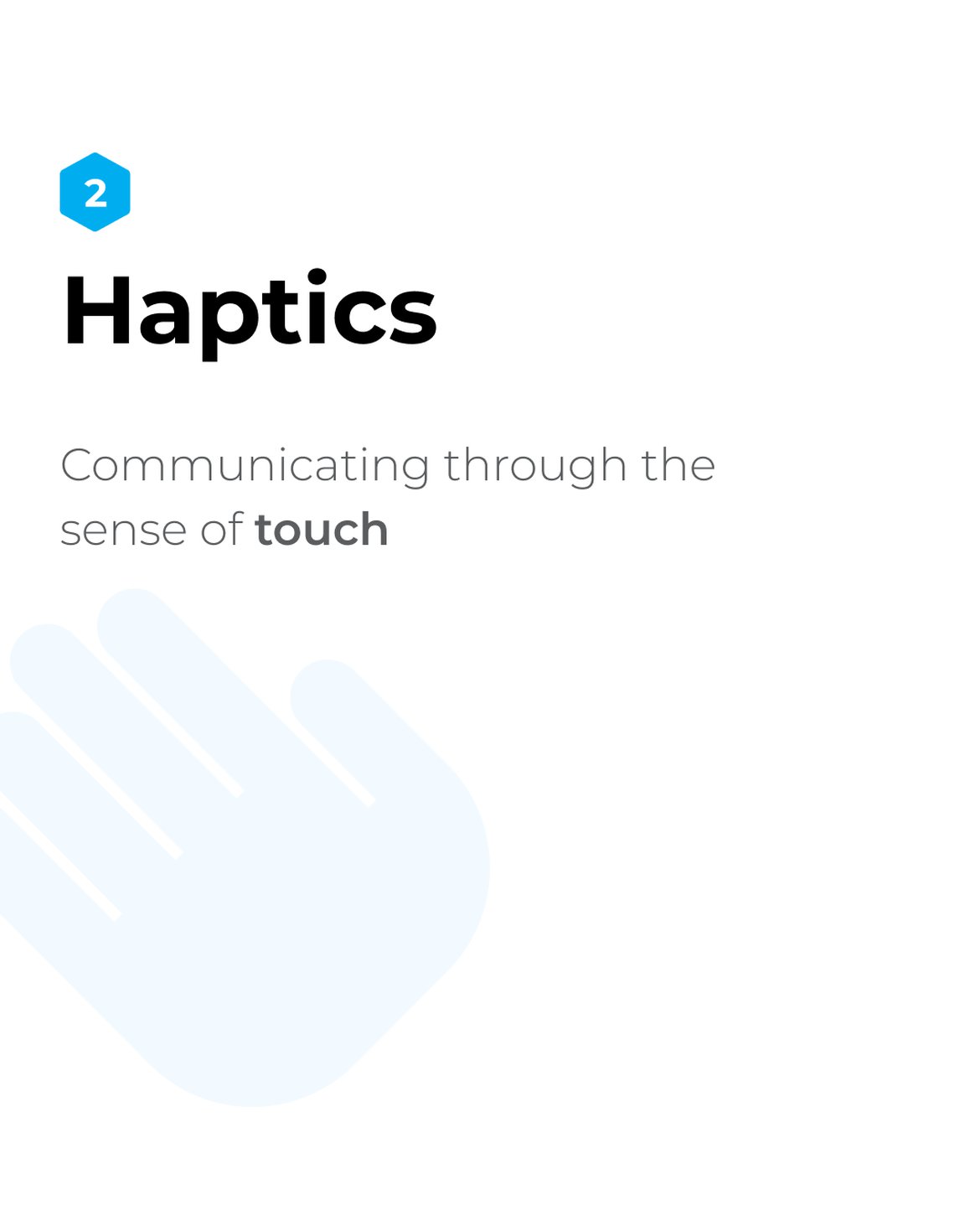 Haptics may also be regarded as 3D touch or kinaesthetic communication. It includes technology that uses tactile sensations such as vibrations, motions or other forces to stimulate the sense of touch in a user experience.